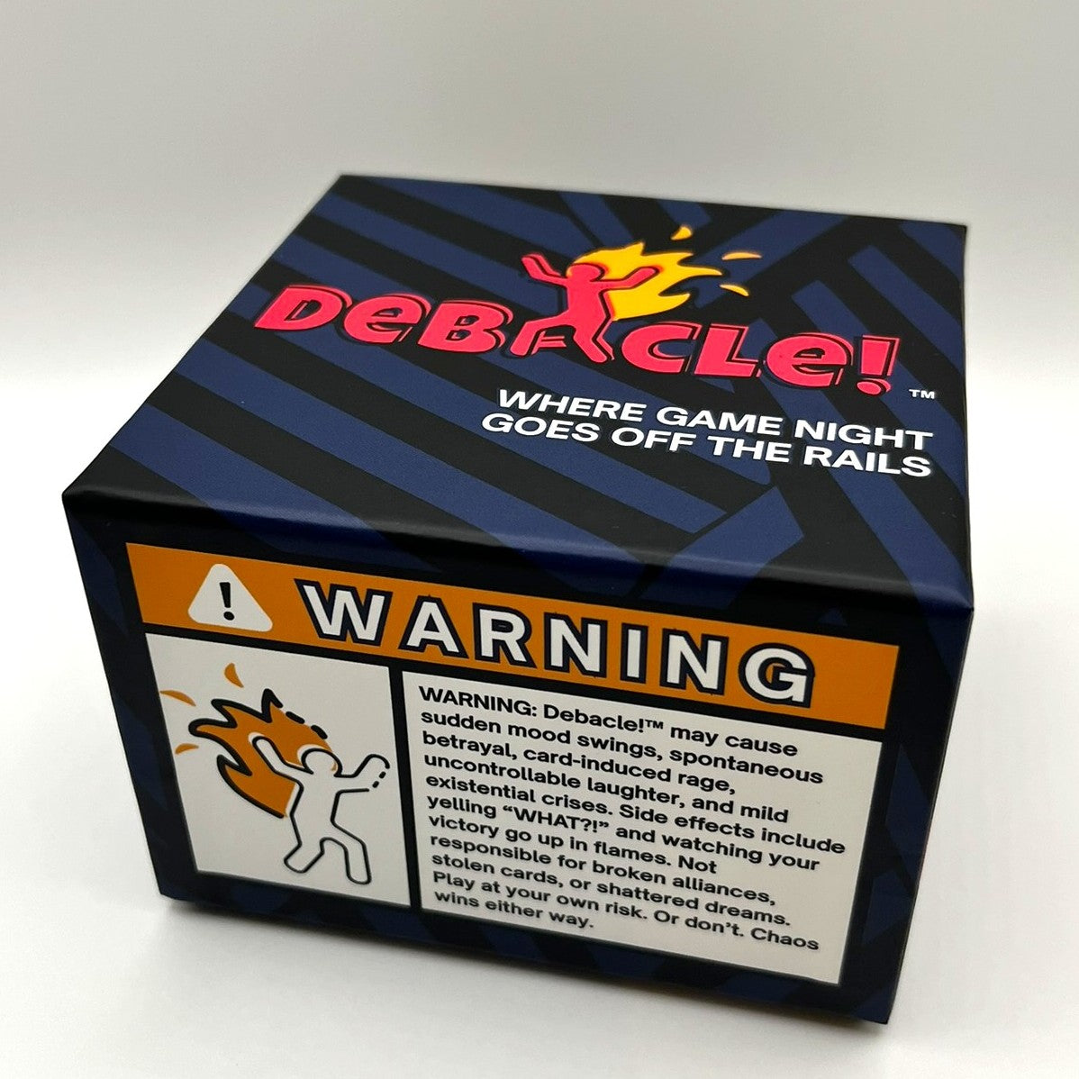 WARNING: Debacle!™ may cause sudden mood swings, spontaneous betrayal, card-induced rage, uncontrollable laughter, and mild existential crises. Side effects include yelling “WHAT?!” and watching your victory go up in flames. Not responsible for broken alliances, stolen cards, or shattered dreams. Play at your own risk. Or don’t. Chaos wins either way.